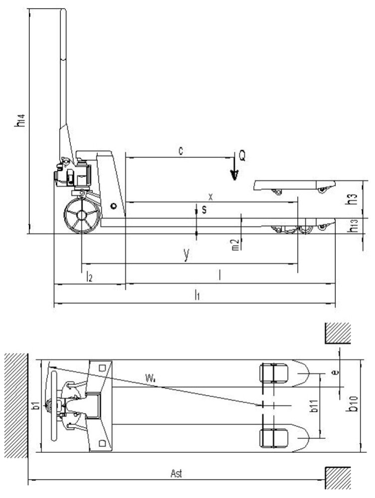 • Unghi de direcție de 210°: transpaleta poate fi ușor de rotit și manevrat. Puteți ridica și muta manual paleții cu ajutorul mânerului aflat în cadrul timonei. Pentru coborârea sarcinii eliberați mânerul într-o manieră dozată și continuă.